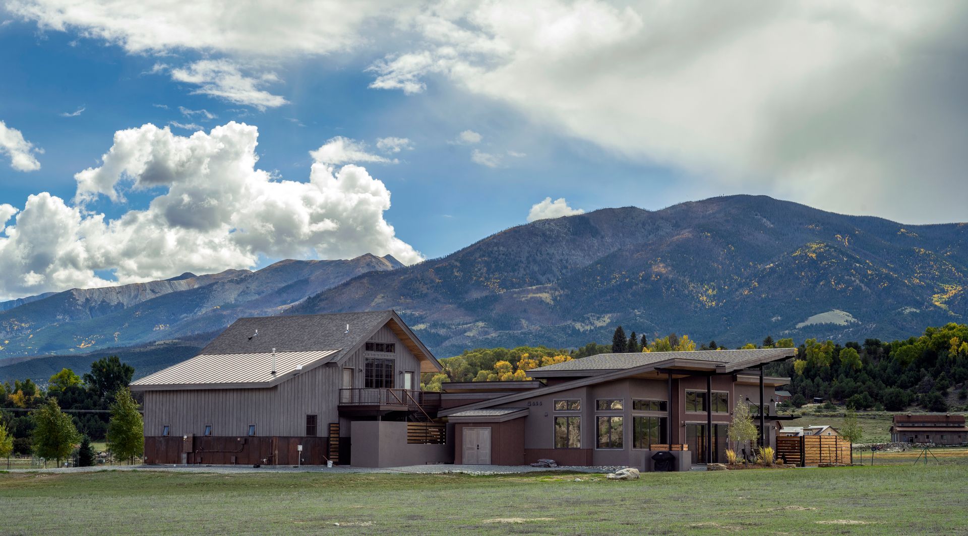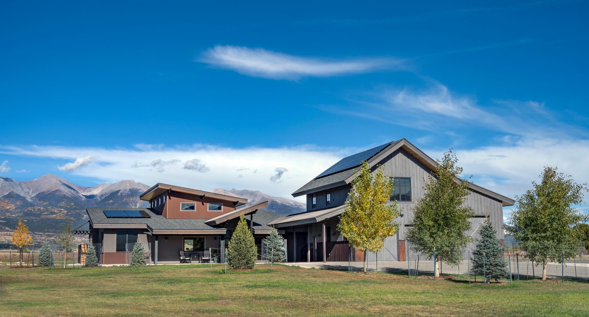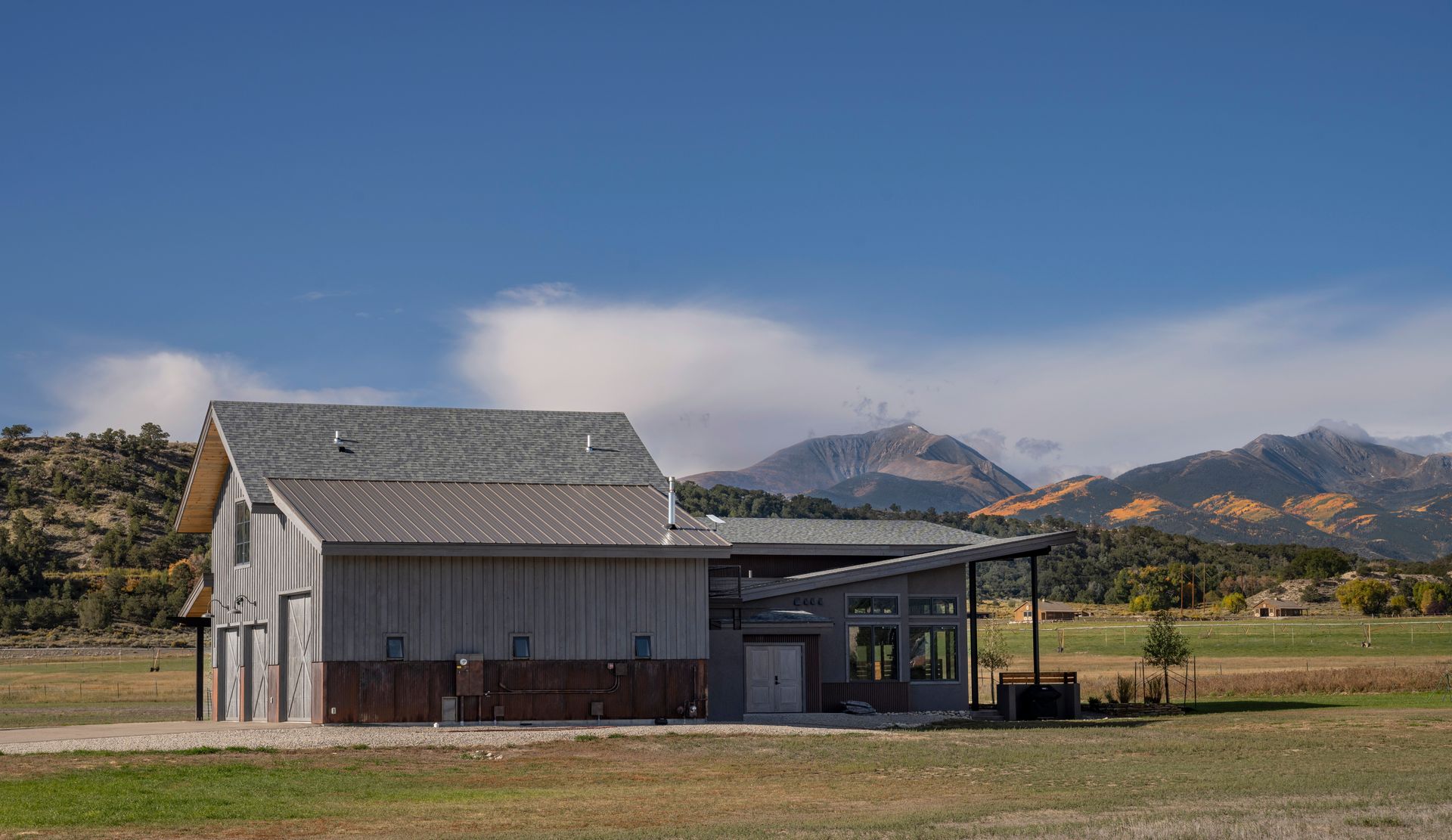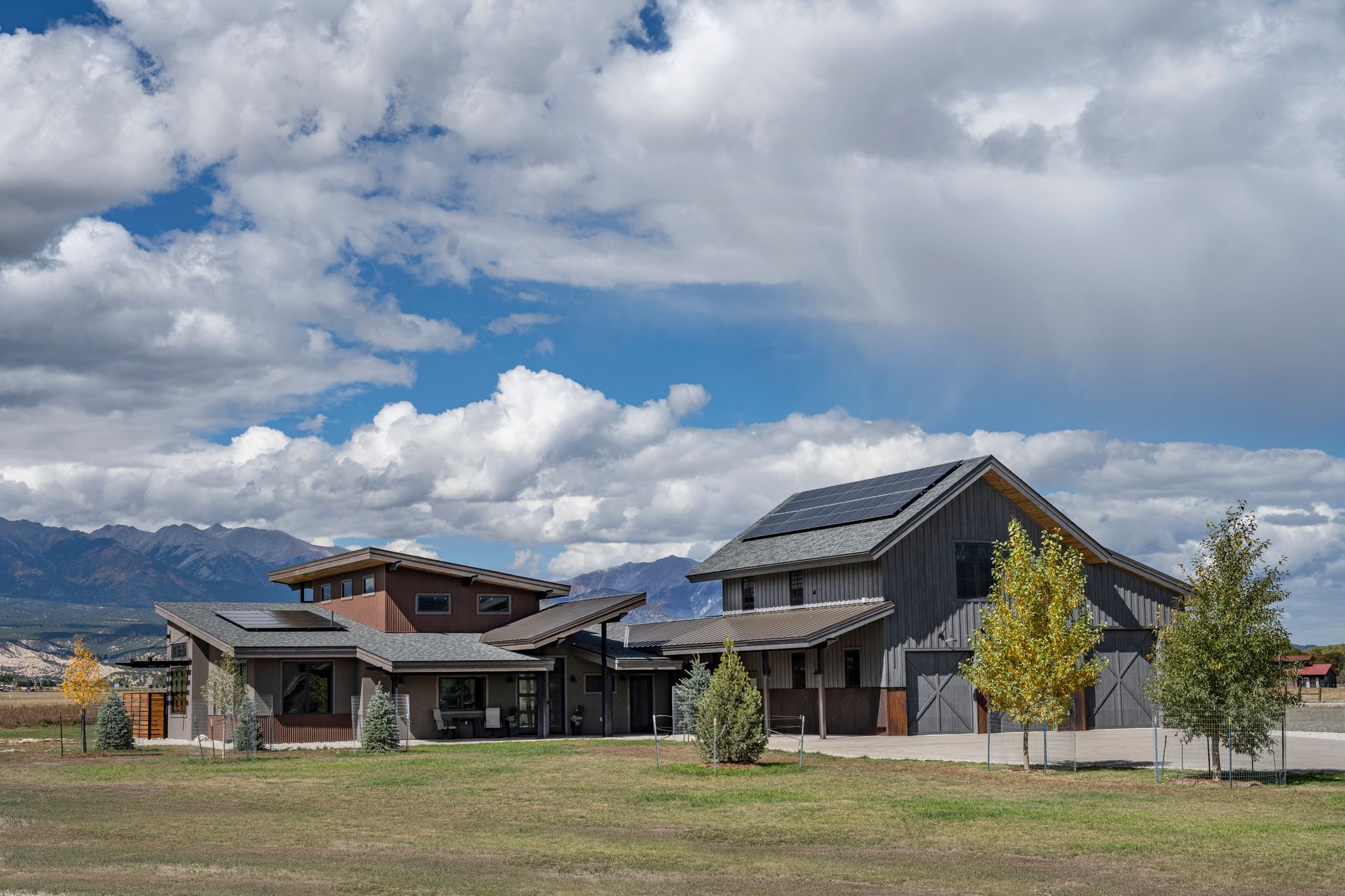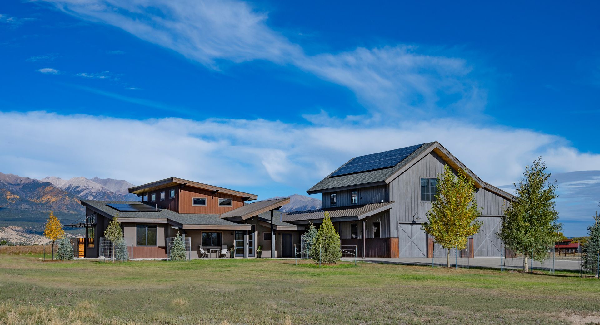 Phase-2 was the construction of the Main House, which commenced construction in 2022. The Main House includes 2 bedrooms, 2.5 bathrooms, and a home office. The large west-facing windows of the Main House have sweeping 180° views of the 14,000’ peaks of the Sawatch Range. The Main House with the “Barn-dominium” were designed to lower the “Carbon-Footprint” of the Owners, with extensive PV solar applications, and all electric mechanical systems.