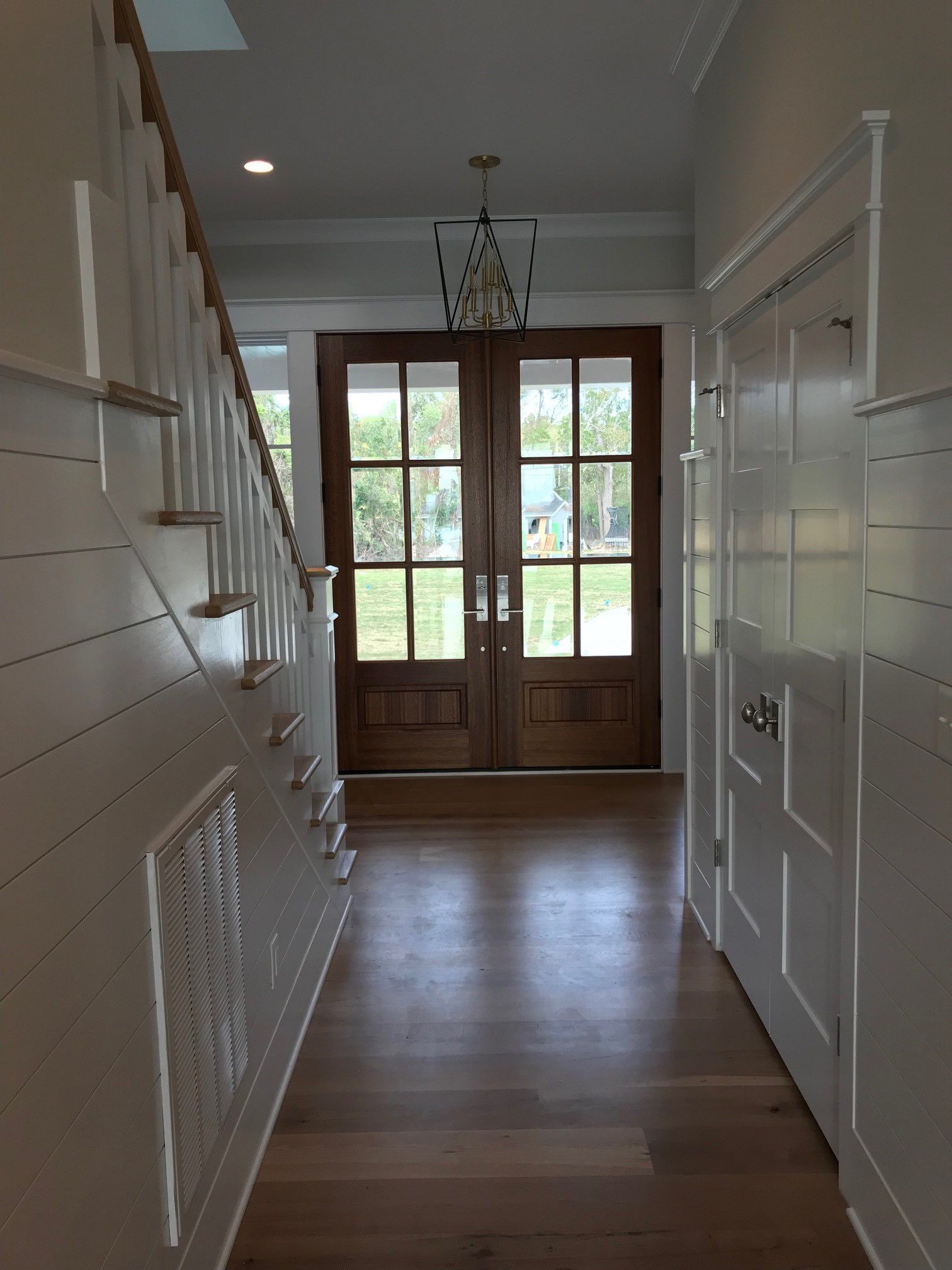 This custom home was designed for a family who relocated to North Carolina from Texas, to enjoy "life on the water." The 3 acre property is on Page's Creek adjacent to the inter-coastal waterway, and features views of the ocean at nearby Mason's Inlet, as well as large old-growth deciduous trees. The main concept of this house is to nestle into the grand existing trees (without losing any), while maximizing views of the ocean & inter-coastal waterway. The main level has the master suite, and great room with water views, and exterior porches and decks wrapping around 3 sides of the house. Four bedrooms for their 3 sons and guests are located upstairs with a TV den. This is the second home design by Equinox for this family.